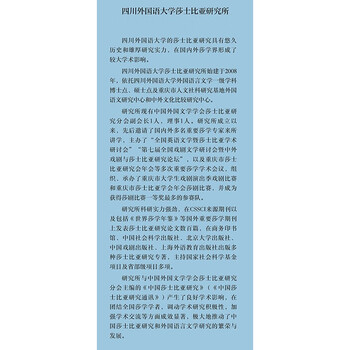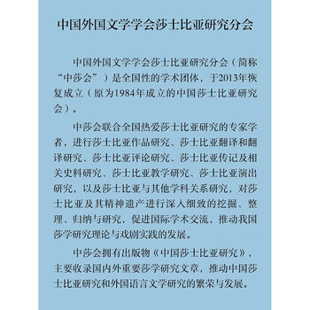 《中国莎士比亚研究》为系列研究图书,致力于世界莎学研究、马克思主义莎学研究、莎士比亚总体研究、莎士比亚悲剧、喜剧、历史剧、传奇剧研究,莎士比亚十四行诗及长诗研究、莎士比亚戏剧改编研究、莎士比亚舞台、莎士比亚翻译研究等方面的研究。本书主要包括莎士比亚与文学思潮研究、莎学译文、莎士比亚与世界、莎言莎语、莎士比亚戏剧教学与翻译研究、续史贯珍、莎学书简,以及纪念莎士比亚诞辰460周年专栏。全书语言流程,条理清晰,是国内学者做莎士比亚相关研究的重要参考图书。