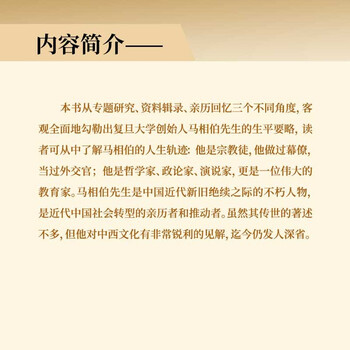 本书从专题研究、资料辑录、亲历回忆三个不同角度,客观全面地勾勒出复旦大学创始人马相伯先生的生平要略,读者可从中了解马相伯的人生轨迹:他是宗教徒,他做过幕僚,当过外交官;他是哲学家、政论家、演说家,更是一位伟大的教育家。马相伯先生是中国近代新旧绝续之际的不朽人物,是近代中国社会转型的亲历者和推动者。虽然其传世的著述不多,但他对中西文化有非常锐利的见解,迄今仍发人深省。