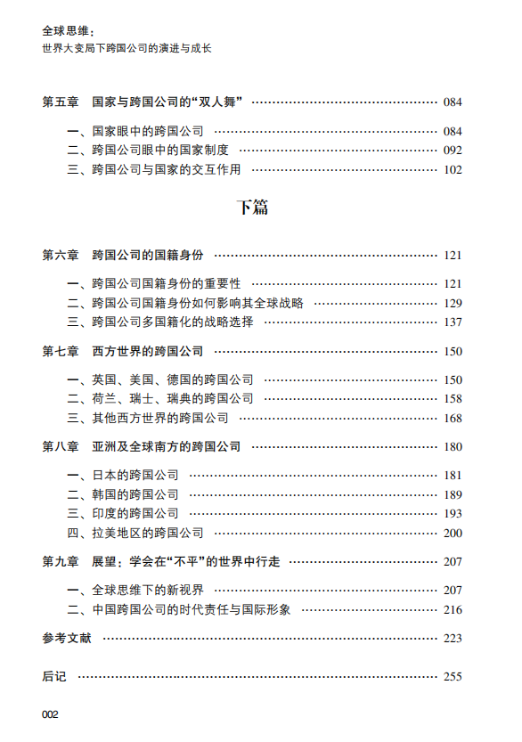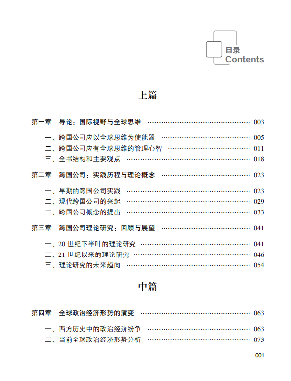 《全球思维:世界大变局下跨国公司的演进与成长》站在人类历史进程的一个交汇点上去回顾过去和展望未来, 21世纪, 无论面对多么复杂的全球政治经济局势, 终将会有一批中国企业冲破重围, 破茧成蝶。 这个时代, 需要中国企业以无比的勇气、 想象力和创造力, 与未来的不确定性主动接触, 作激情碰撞探寻通向远方的道路。在此期间中国企业要学会运用全球思维, 接纳与适应我们所能观察到的全球政治经济冲突与矛盾起伏波动的现状, 对未来发展的可能性, 抱持开放与包容的管理心智, 进而为共建全球性的国家与跨国公司之间的合作生态系统做出最为务实的努力与贡献。