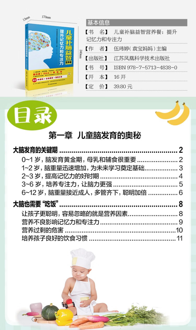 本书是一本专为孩子量身打造的科学食谱,从6个月宝宝的初期辅食到学龄期健脑营养餐,全面覆盖孩子成长各阶段的饮食需求。书中精选富含DHA、卵磷脂等益智食材的菜肴,搭配均衡营养,帮助提升记忆力与专注力,尤其适合学习关键期的孩子。